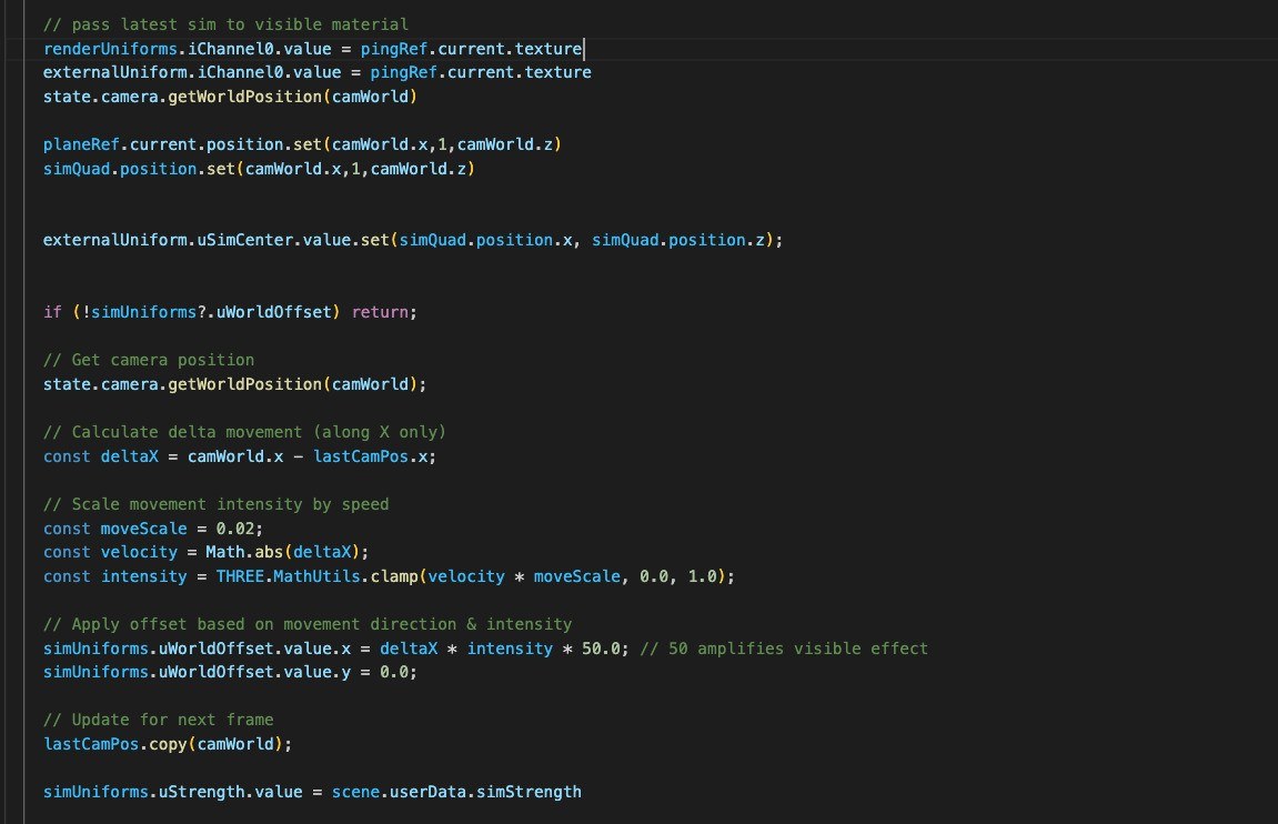 The water on our website covers a very large area. Simulating ripples over the entire surface would be expensive and would reduce sharpness. We solved this by running the simulation only inside a smaller area that sits directly under the camera view. To the user, it feels like the entire sea is reacting. In reality, we are only simulating a compact section and moving it with the camera. This keeps the effect sharp, clean, and highly optimized.